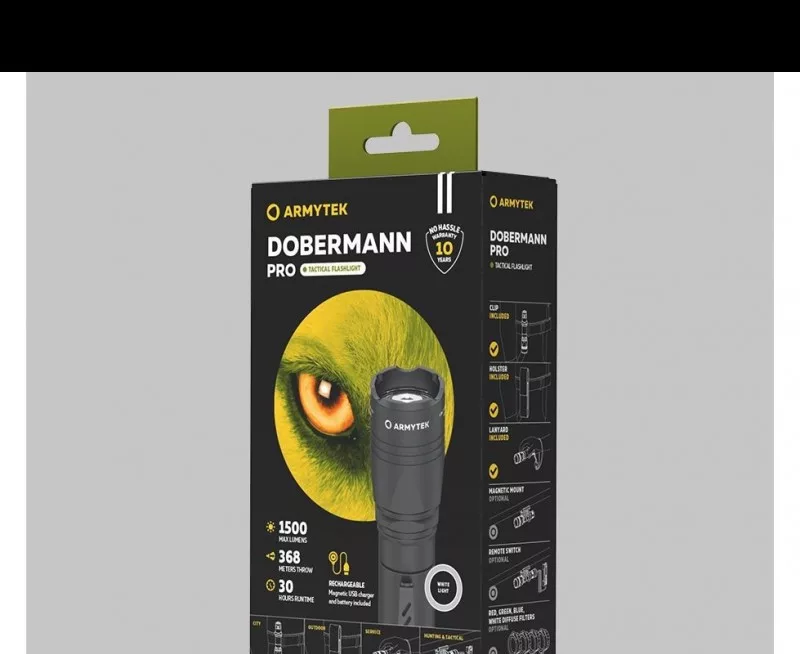 Az 1500 lumen fényerejű zseblámpa közepesen, 100-200 méteres (maximális fénytávolság 368 méter) feladatok megoldására alkalmas. A Dobermann Pro magával vihető hosszú utakra vagy szabadtéri kikapcsolódásra. Mint a frissített taktikai kínálat minden modellje, ez is egy kész high-tech megoldás, mellékelt akkumulátorral és mágneses kábellel, bármilyen USB-forrásról tölthető. A szabványos, 1 hüvelyk átmérőjű test lehetővé teszi további taktikai kiegészítők használatát: bármilyen fegyvertartó és eredeti távkapcsolók. A kényelmes mindennapi hordozáshoz a készlet strapabíró nylon tokot, acélcsipeszt és zsinórt tartalmaz.