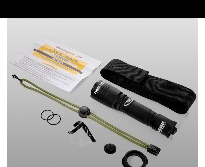 1 db Armytek dobermann lámpát, 1 db tokot, 1 db zsinórt, 1 db csipeszt, 1 db gumi markolatot, 1 db gumigyűrűt, 1 db tartalék gumi gombbot, 2 db tartalék O-gyűrűt és 1 db kézikönyvet.