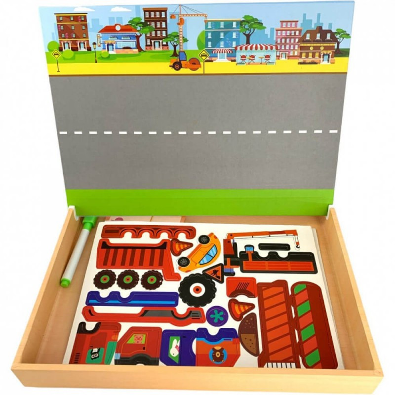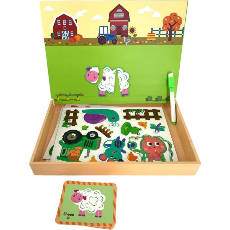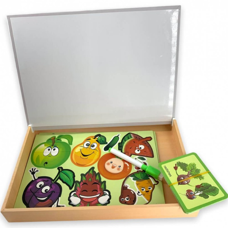 A kirakós játék egy praktikus dobozban érkezik, amelynek a teteje belehelyezhető a peremen elhelyezett sínekbe, aminek egyik oldalára rakosgathatják, párosíthatják a mágnessel ellátott zöldségek és gyümölcsök képei a gyerekek. A másik oldalára pedig kedvük szerint rajzolhatnak a játékban található filc segítségével. A párosításhoz kártyák is találhatók a dobozban, amelyből, ha egyet kiválaszt a gyermek, azt kell ráhelyeznie a felületre. A játék segítségével a gyermekek megismerkedhetnek a zöldségekkel, gyümölcsökkel, valamint fejleszthetik a rajzkészségüket is.