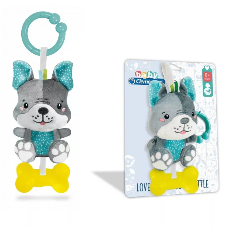A termék a műanyag gyűrűnek és a fején található függesztőnek köszönhetően egyszerűen fellógatható bárhova. A kutyus fülecskéje és feje csörgővel lett megtöltve, így ha a gyermek megrázza, vagy megnyomja az rezegni és csörögni kezd. Ez ösztönzi őket finommotorikus készségük és kézügyességük fejlesztésére, miközben lefoglalja a gyermeket. Az alján található egy műanyag csont is amely a pici fogzásában lehet nagy segítség, hiszen rágása csillapíthatja a fájdalmat.