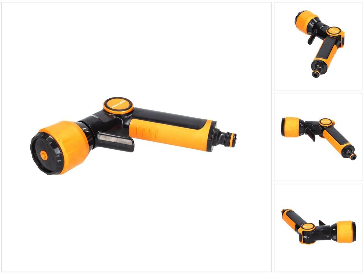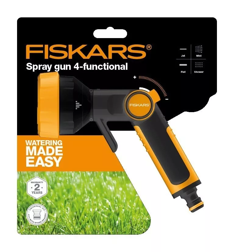 Ez a  Fiskars multifunkciós locsolópisztoly univerzális csatlakozással van ellátva, így más márkákkal is kompatibilis. Ergonomikus kialakításának és kényelmes SoftGrip markolatának köszönhetően nagyon egyszerű és könnyű használni, nem fárad el közben a kéz túlságosan. A hüvelykujjas áramlásszabályozó ki/be kapcsolható és fokozatmentesen szabályozható.