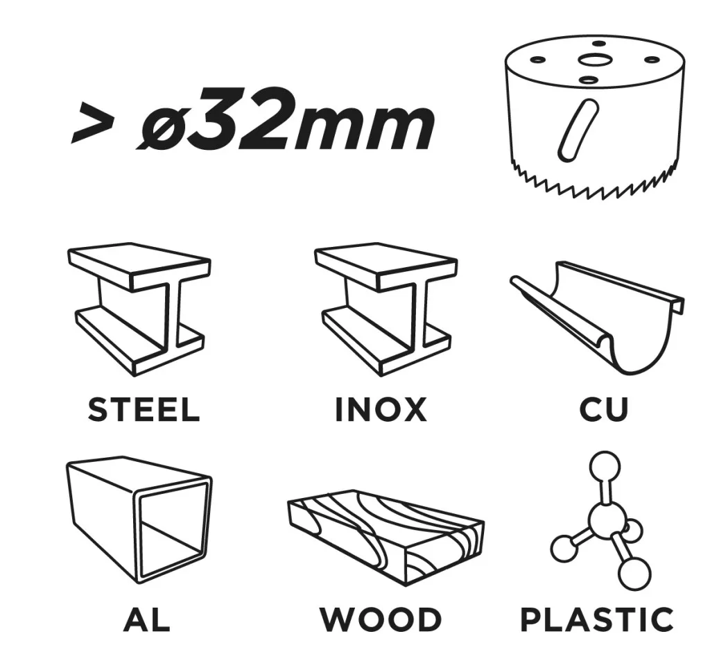 A GRAPHITE bimetál koronafúrók felfogatására szolgál. A készletben van vezető fúrószár, de ez külön is megvásárolható.
