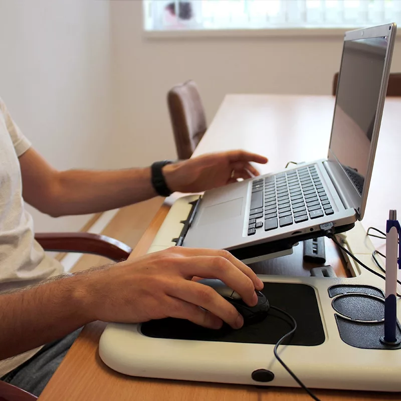 A strapabíró anyagból készült asztal stabilan tartja laptopodat, miközben extra helyet biztosít egérnek, mobiltelefonnak vagy akár egy kávéscsészének. A szellőzőnyílások pedig megakadályozzák a készülék túlmelegedését.