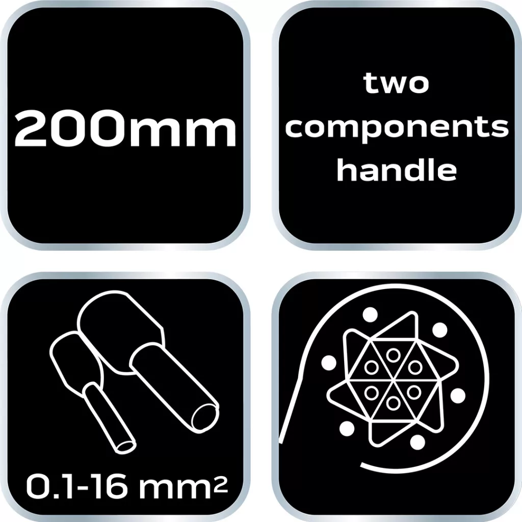 NEO 01-548 érvéghüvely fogó, 6 szögű pofa, hüvely átmérő: 0,1 - 16 mm2 keresztmetszetű hüvelyvégek megmunkálására nyújt lehetőséget. Ez a széles műveleti tartomány, de a szerszámhoz használt tartós anyagok - szénacél a testhez és 40Cr acél a pofákhoz - is hozzájárulnak a szerszám robosztusságához és több éves tartósságához. A fogó emellett kétkomponensű fogantyúval van ellátva, amely használat közben kényelmet és ergonómiát biztosít. A szerszám 205 mm hosszú, és precíz krimpelést biztosít a hüvelyátmérők széles skáláján. Számos feladatban tökéletesen teljesít.