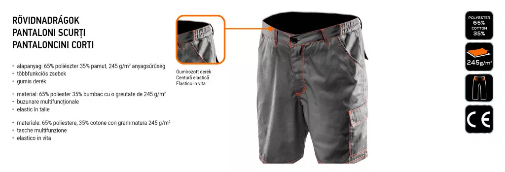 A BASIC rövidnadrág kényelmes és praktikus nyári ruházati termék úgy a szakemberek számára, mint a barkácsolóknak, aki maguk végzik az otthoni felújításokat. Strapabíró pamut-poliészter keverékből készül. A rugalmas guminak köszönhetően az övrészben jól fekszik a deréknál. A többfunkciós zsebek még nagy terhelést is kibírnak, elférnek benne a munka közben szükséges szerszámok. A CE tanúsítvány igazolja az európai biztonsági normáknak való megfelelést. A NEO márka a professzionális igényeket is kielégíti. Munkanadrág,rövid,BASIC, 35% pamut, 65% poliészter, 245 g/m², többfunkciós zsebek, gumírozott derék, CE, EN ISO 13688:2018