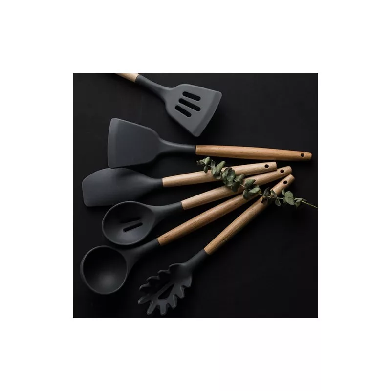 • Átfogó megoldás: Ez a szett 12 elemből áll, beleértve 11 különféle konyhai eszközt és egy praktikus tárolóedényt. Minden egyes eszköz különböző feladatokat lát el: spatulák, merőkanalak, tésztaszedő háló, habverő, kanalak, fogó és ecset – minden, amire szükséged lehet a konyhában!