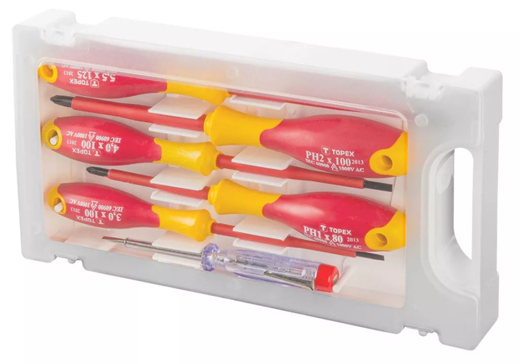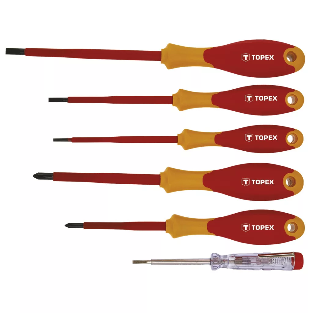 A TOPEX csavarhúzókészlet a legfeljebb 1000 V feszültség alatti munkákra szolgál. Az öt csavarhúzó mindegyike kiváló minőségű króm-vanádium acélból készült. Ezen felül a készlet tartalmaz egy 125-250 V között használható fázisceruzát is. Az ergonómikus, csúszásmentes anyaggal bevont műanyag markolat biztosítja a kényelmet és a biztonságot a munkavégzés során. A TOPEX márka ezermestereknek készül. Csavarhúzó 1000 V, 6 db‑os készlet, tanúsított, CrMo acél, bimateriál markolat, méretek: 3 x 100 mm, 4 x 100 mm, 5,5 x 100 mm, PH1 x 80 mm, PH2 x 100 mm, fázisceruza 125- 250 V
