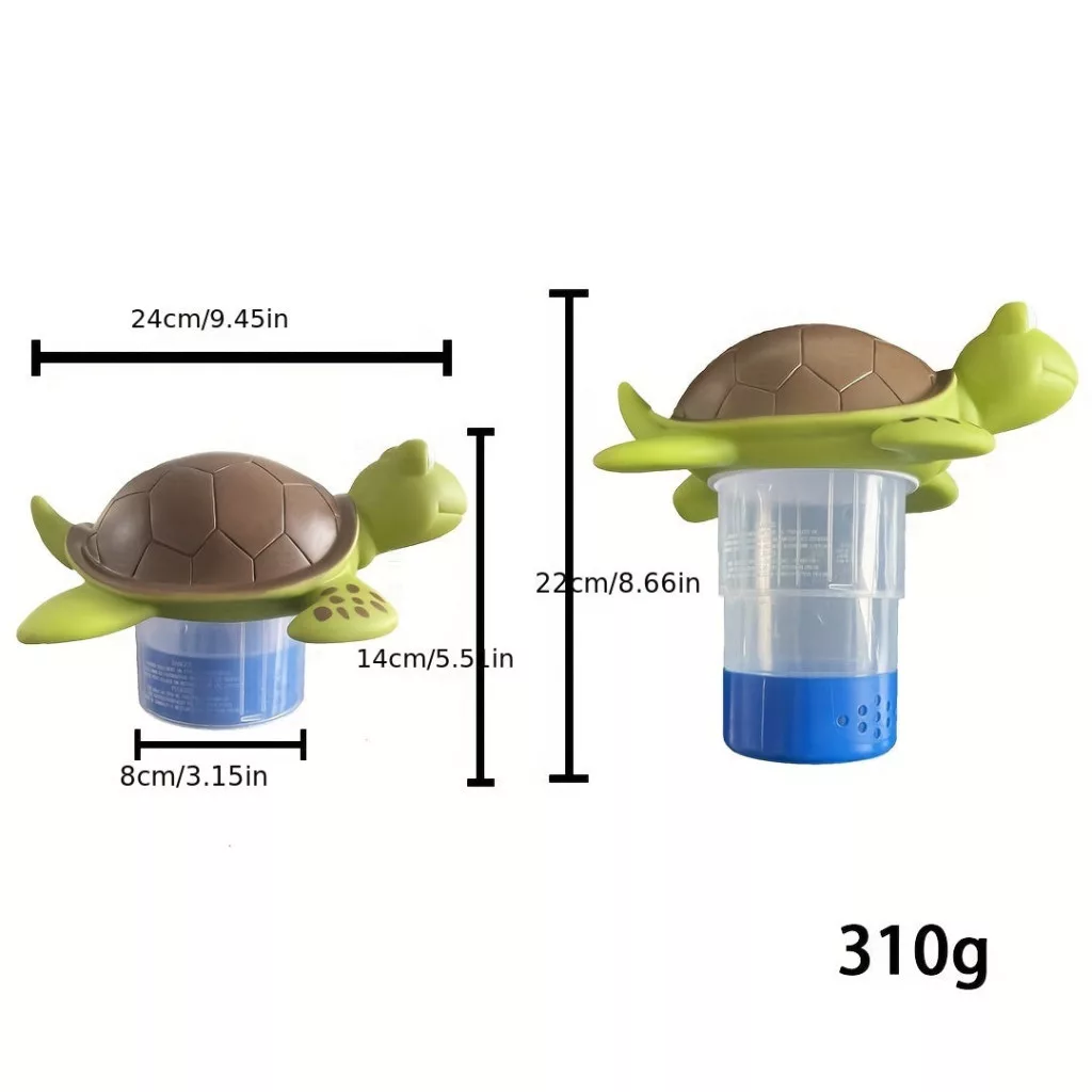Fedezd fel a medence karbantartásának új dimenzióját az úszó teknős formájú medence klóradagolóval! Ez az egyedi és praktikus kiegészítő nemcsak a medencéd vízének tisztaságát biztosítja, de egyedülálló megjelenésével a kerted dísze is lehet. A teknős formája kedves és barátságos, így a gyerekek is imádni fogják. Az adagoló használata rendkívül egyszerű: csak helyezd bele a klórtablettát, és hagyd, hogy a teknős elvégezze a munkát, miközben szabadon úszkál a medencében.