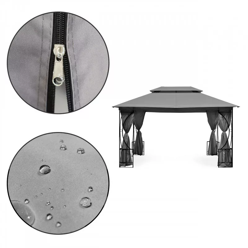 A tető és falak tartós és időjárásálló poliészter anyagból készültek elegáns szürke színben.