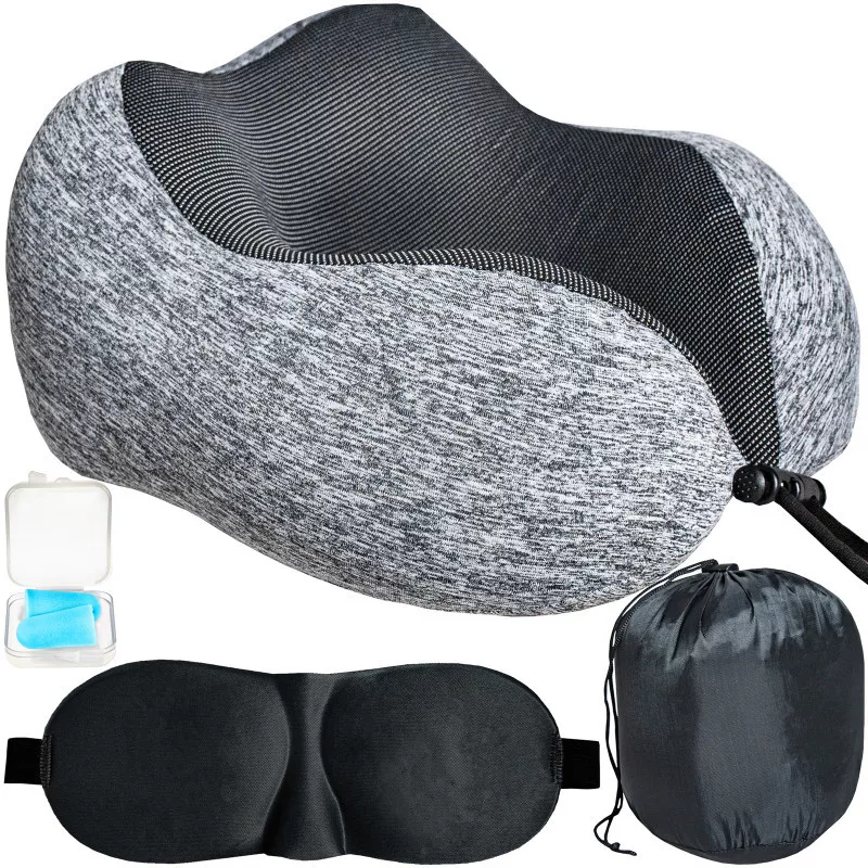 Memóriahabos nyakpárna/utazópárna – szemkötővel és füldugókkal