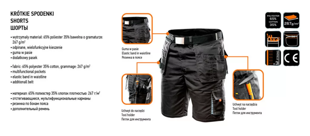 Vélemények NEO TOOLS Rövid munkásnadrág, HD, Heveder övvel, levehető zsebek, M/50 81-270-M
