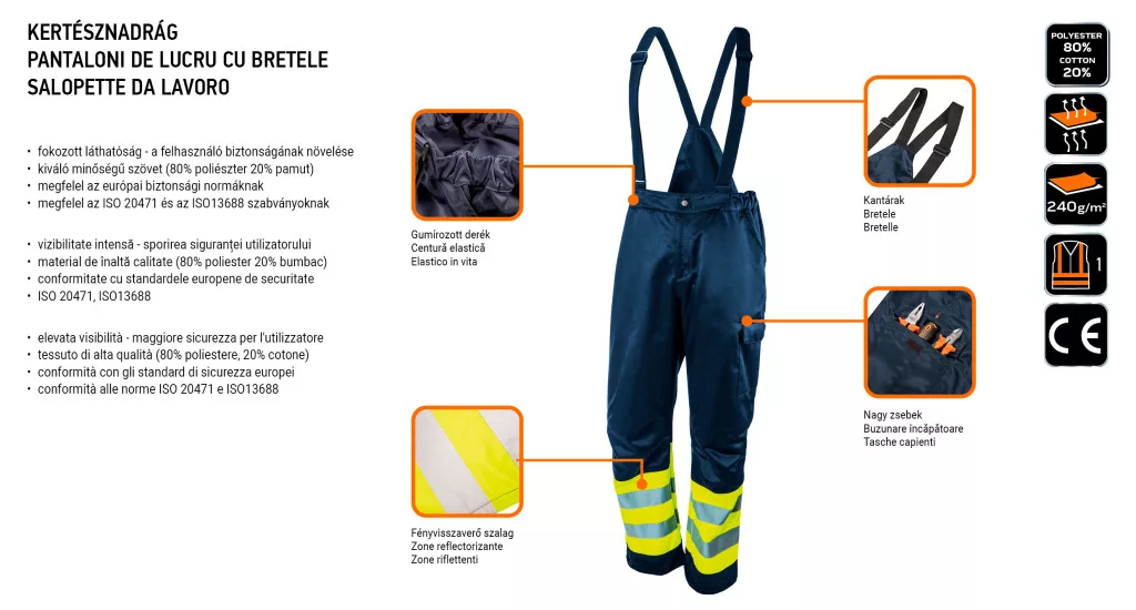NEO láthatósági kantáros munkanadrág, sötétkék színű, intenzív láthatóságú részekkel, a viselője biztonságát növelő praktikus megoldás legyen szó nappali világítási körülményekről vagy sötétben, mesterséges világításnál, pl. a gépkocsik lámpáinak fényében. Kimagasló minőségű és szívós poliészter és pamut keverékű. A termék EN ISO 13688:2013 szabvány szerinti kivitelezése és az európai tanúsítványa minőségének garanciája. Az európai biztonsági standardoknak való megfelelőséget a CE tanúsítvány biztosítja. A NEO márka a professzionális igényeket is kielégíti.