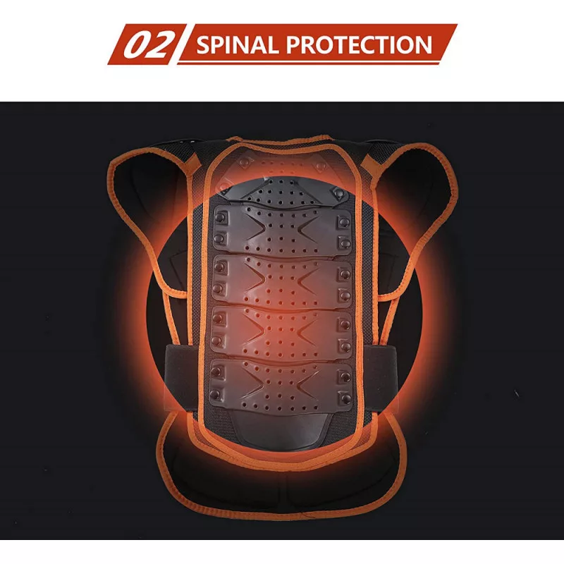 A mellény hátvédőjének hossza 48 cm, amely megfelelő védelmet nyújt a gerincnek és a hátának. A protektorok nagy sűrűségű EVA hab szintetikus ragasztóval vannak rögzítve, amely biztosítja a tartósságot és a törhetetlenséget. Az anyagok minőségi anyagok, amelyek hosszú élettartamot biztosítanak a védőmellénynek.