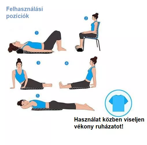 Még a matracot (párnával kiegészítve) fekvő helyzetben történő használaton felül fotelbe/székbe helyezve akár a hát, farizom, comb és váll, továbbá földre terítve, majd ráállva a talp kezelésére is használhatja, addig a párnát önállóan a nyak és fej közötti hajlatba helyezve elsősorban az ezen területeken található izmok oldására és a fejfájás, migrén oldására is, továbbá a stressz- és alvászavarok csökkentésére is használhatja.